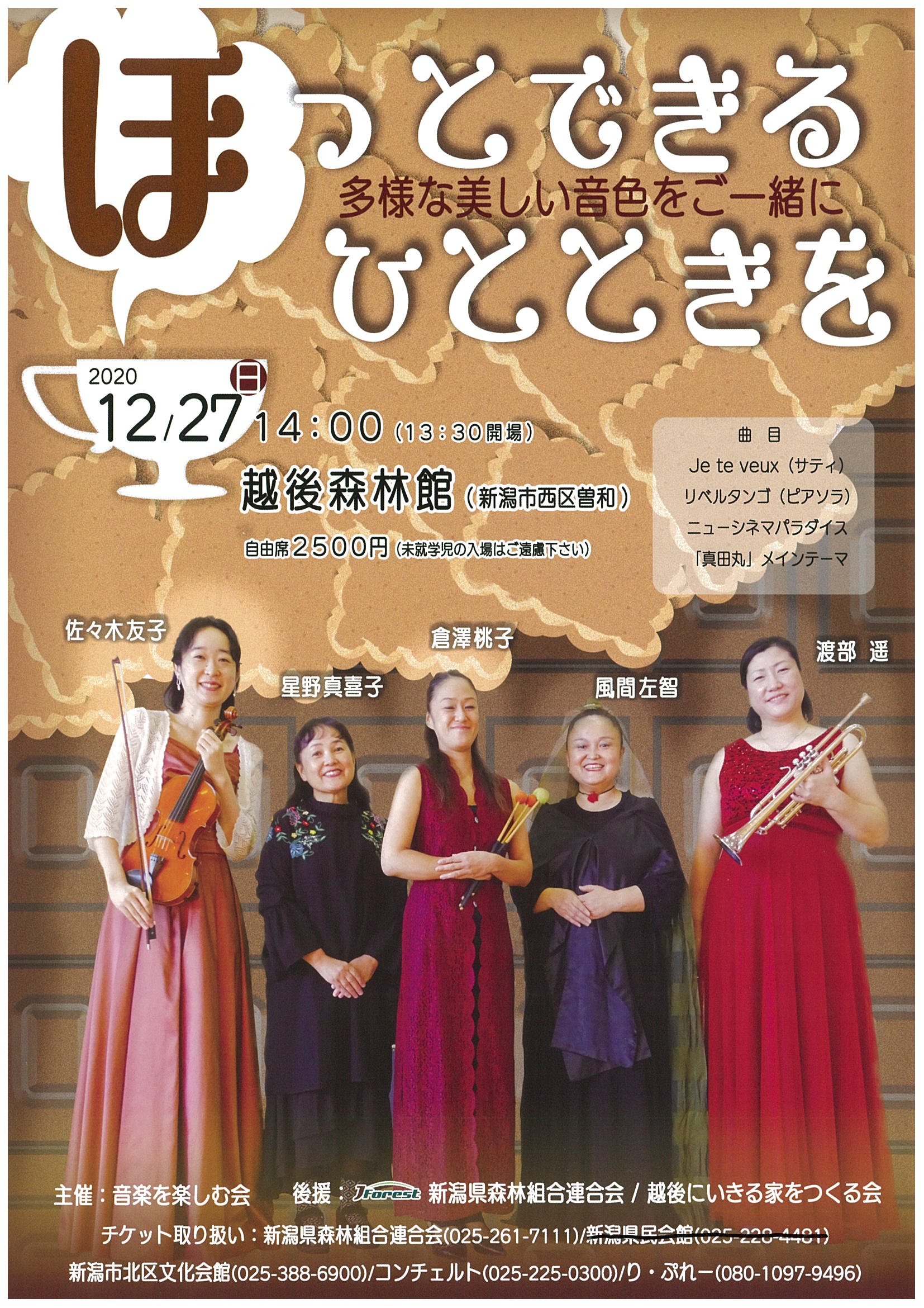 12/27(日)14:00からこだまホールにて音楽を楽しむ会の主催で「ほっとできるひとときを-多様な美しい音色をご一緒に-」が開催されます。