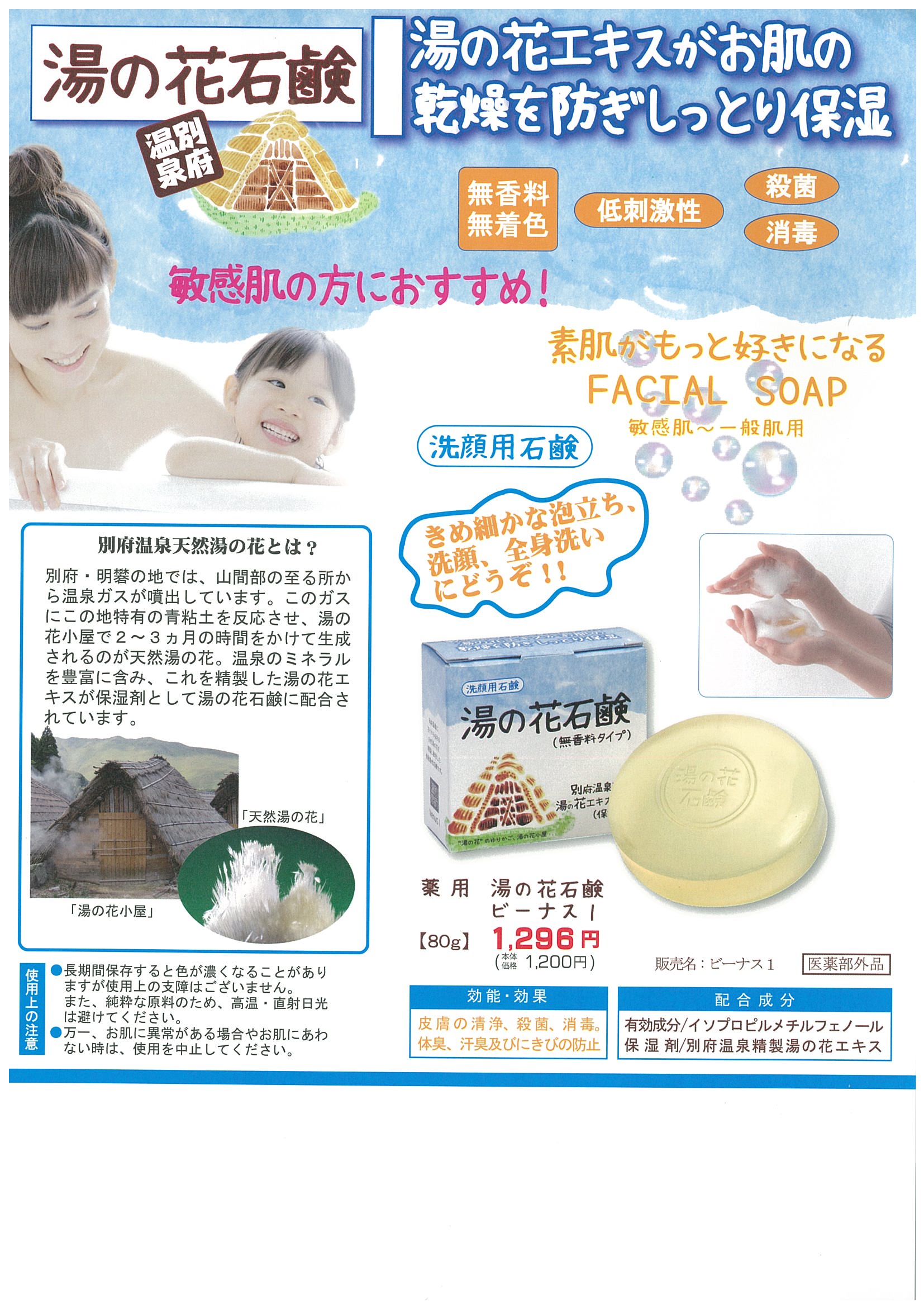 別府温泉の湯の花エキスが入ったお肌にとても優しい洗顔石鹸です。
