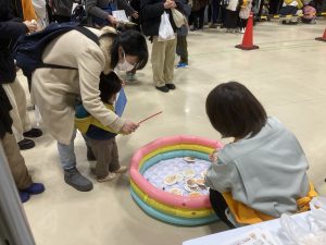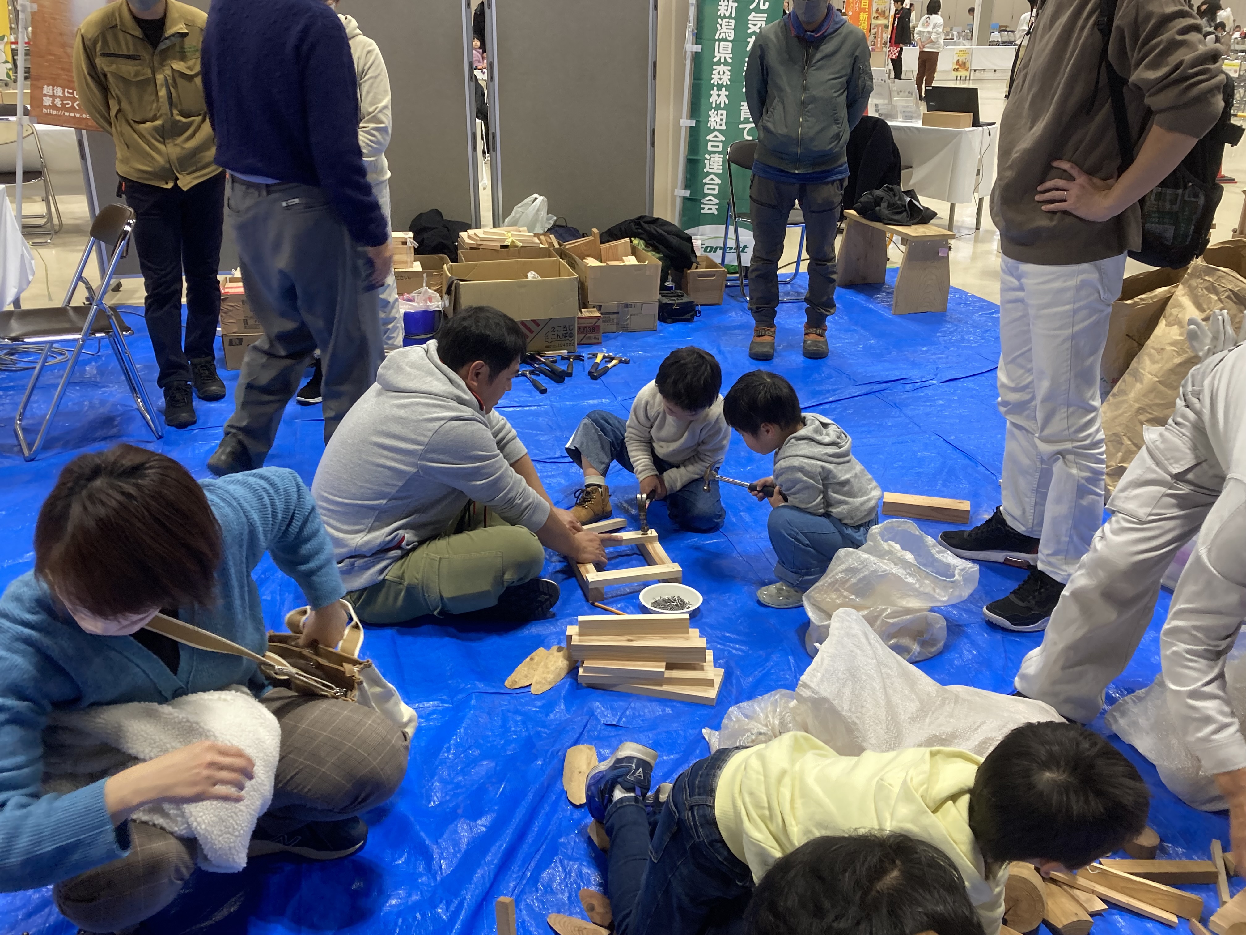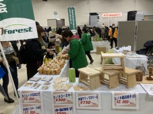 森林組合連合会のブースでは、新潟県産のきのこや木製品の販売、木製のミニクリスマスツリーやイス、プランターを作る体験ができる木工教室、きのこ釣り体験を実施しました。