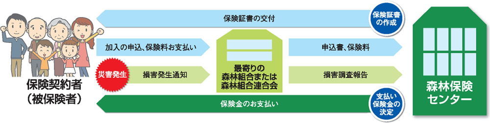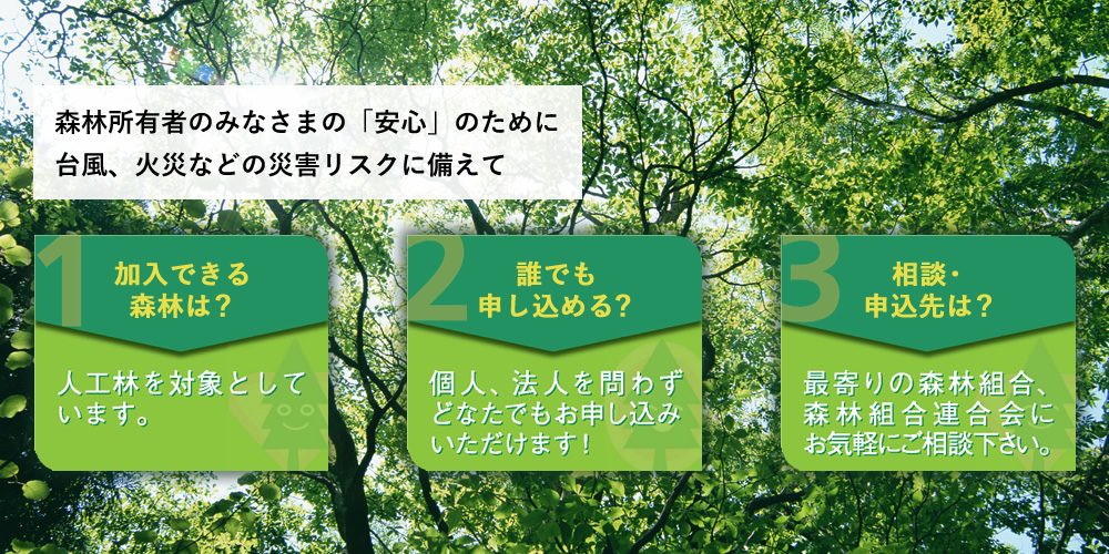 森林保険は、「森林保険法」(昭和12年法律第25号)等に基づき、森林所有者を被保険者として、森林についての火災、気象災、噴火災による損害を総合的に補償するものです。森林所有者が自ら災害に備えることができる唯一のセーフティネットです。持続的な森林経営にきっとお役に立ちます。