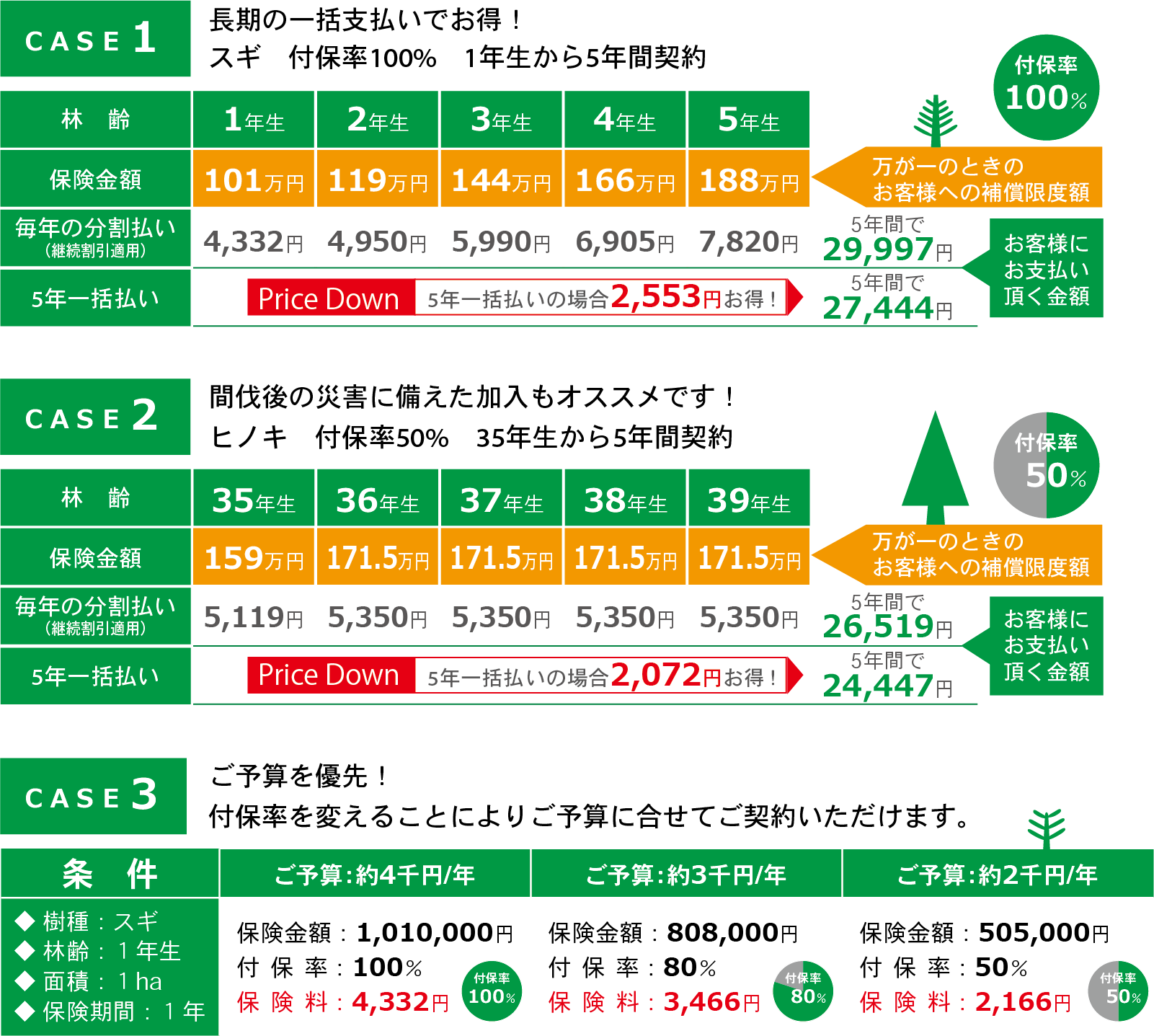 保険料の試算は、森林保険センターのホームページ上で簡単にできます。 また保険料は付保率を変えることで、ご予算に合わせてご契約いただける形となっております。